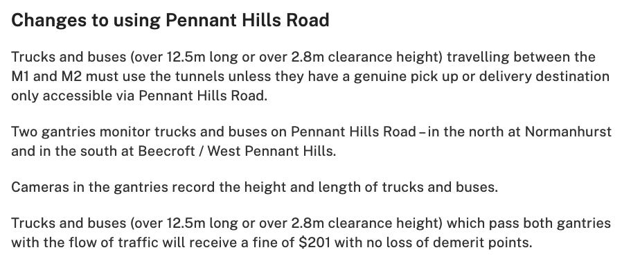 This is the type of charge Sydney has introduced for one vehicle type in one corridor. In northern Sydney, if a large truck is detected moving through the corridor on the surface road rather than on the tollway, they incur a penalty. This charge on through traffic generates higher asset revenue through tolls (and penalties), fewer truck trips on surface roads and travel time savings for the trucking operators.