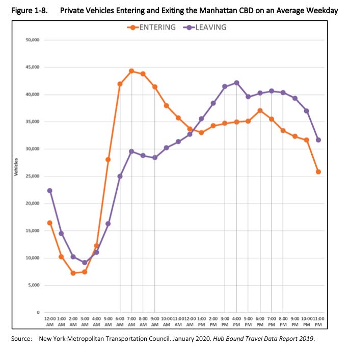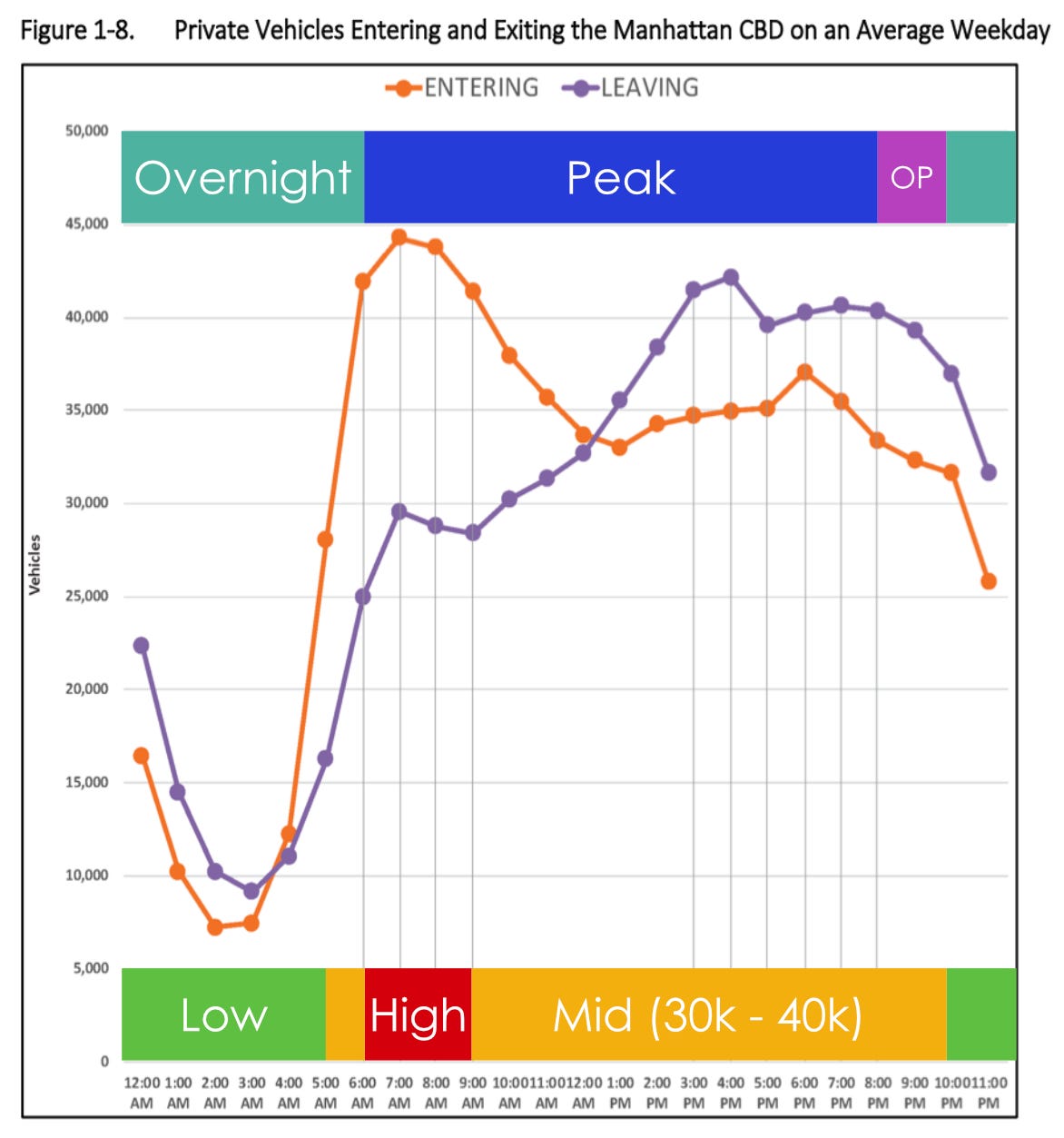 Using this zone and this tariff, the Manhattan scheme aims to raise revenue and reduce the number of inbound trips. The revenue target is $15b to improve subway, bus, and commuter rail systems, while the Pigouvian target is to reduce inbound vehicles by 10% and vehicle kilometres travelled by 5%. (London aimed for a 10 – 15% reduction of vehicles in the centre and a speed increase of 20-30%.)