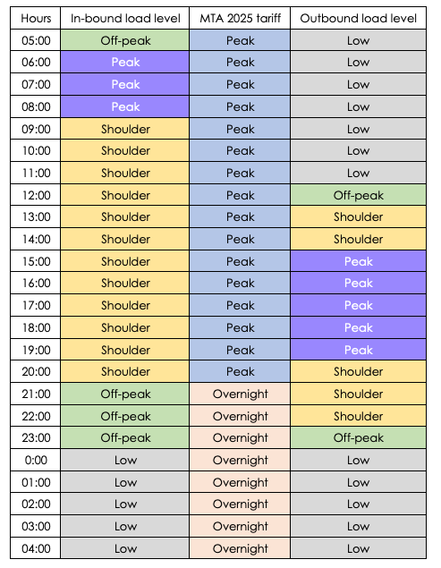 Our comparison between the actual revenue raising system and the imagined load-based system was based on actual load data. We are fortunate that before the MTA introduced the charge, they observed the inbound and outbound loads and published the data. You can see on this chart the load is sometimes low and sometimes high. (The colour bands and categories have been added to the MTA base chart.)