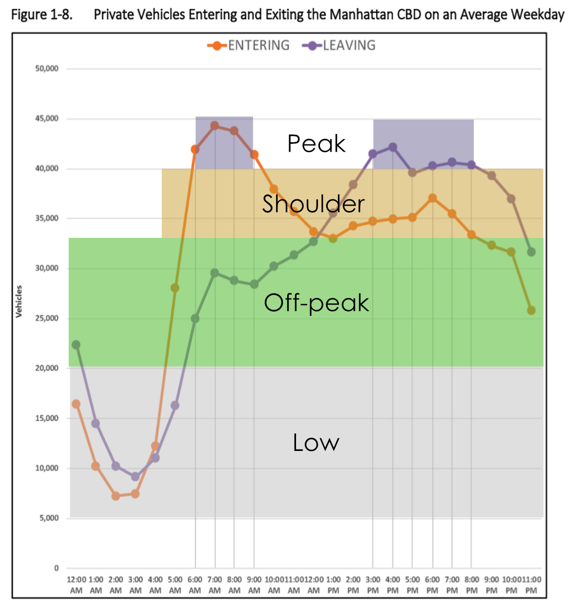 In Manhattan, the inbound load falls from the Peak at 09:00. The MTA, however, to meet its revenue raising goal, keeps charging the highest fee. A load-based scheme would still charge during these hours as the load remains high, but the fee would be at a lower level than at the Peak.